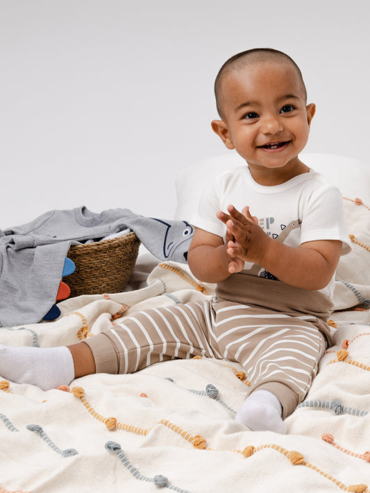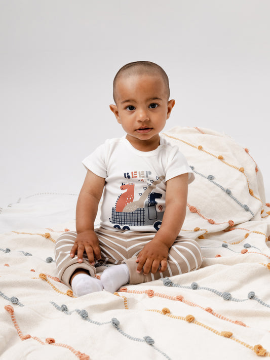 Striped Short Sleeve Dino Adventure Bodysuit - Beige stripes
